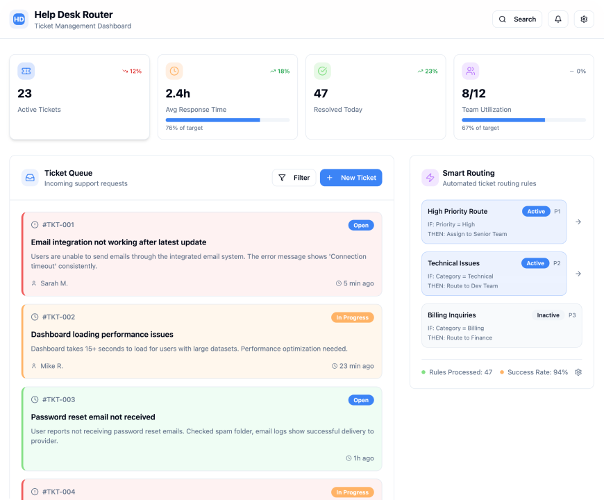 Assigns tickets based on expertise and workload.
